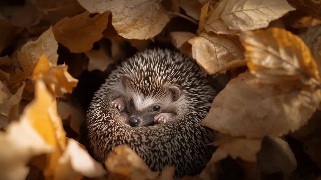 AI Generated Image. Video showing hedgehog peeking from curled ball among autumn leaves, lifting tiny paw and snout while surveying surroundings. Closeup macro framing highlighting spines, soft facial features, warm brown color palette and shallow depth of field creating cozy mood. Serving seasonal marketing, social media reels, wildlife education, blog headers, nature documentaries and pet care content. Pairing with warm acoustic music or gentle narration for storytelling. Suited for autumn campaigns, conservation messaging, children's educational materials and stock footage libraries. Recommended usage including overlaying text, creating slow motion cuts, using as nature B-roll or hero clip for homepage banners. Licensing note: confirming platform usage rights before commercial distribution.