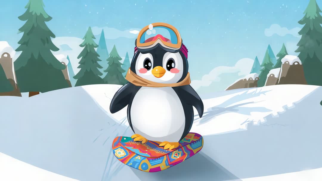 AI Generated Video. Bright animated clip featuring penguin gliding downhill on colorful patterned sled through snowy pine forest. Penguin wearing orange goggles and tan scarf, showing rosy cheeks and joyful expression. Gentle snowflakes falling and soft mountain silhouettes adding cozy winter mood. Smooth camera pan following penguin path down gentle slope, leaving playful trail in fresh snow. Clip working well for kids television content, holiday greeting videos, seasonal social media posts, preschool learning materials, children's app intros, family-oriented advertising, and festive commercial projects. Visual style fitting for animated storybooks, classroom resources, YouTube kids channels, website hero banners, and product packaging for winter toys. Scene looping-friendly for background animations, short promos, and playful transitions in video projects.