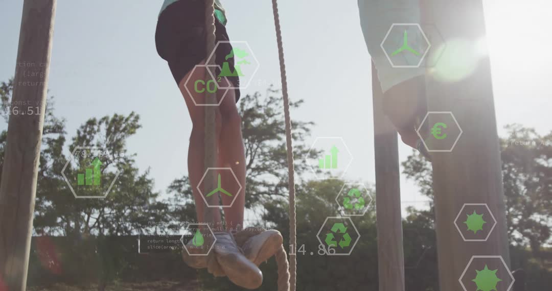 Individuals are participating in an outdoor rope climbing exercise with environmental data and icons overlay. This scene highlights the intersection of adventure sports and technology, emphasizing sustainable living and fitness. The background of trees and natural elements, blended with live data displays, reflects themes of environmental consciousness and physical fitness. This visual can be used for promoting eco-friendly workout programs, outdoor fitness workshops, or technology-driven adventure activities.