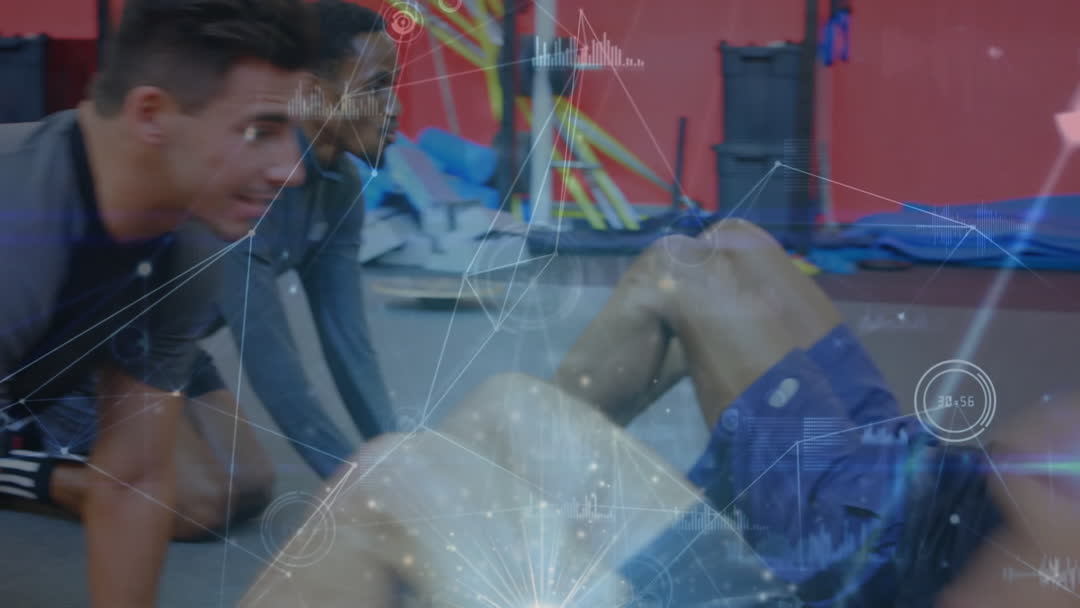 An immersive scene where people are doing core workouts in a gym, layered with digital connection graphics. This ensemble can be used to illustrate themes of smart technology in fitness, data analytics in sports, or modern gym environments. Ideal for use in marketing materials for fitness apps, smart wearables, health tech startups, or futuristic workout promotions.