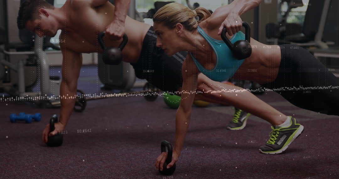 - People Exercising with Kettlebells Amidst Digital Financial Graphics