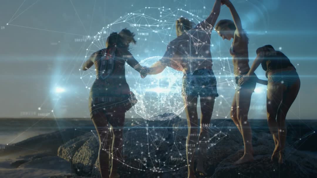 Four people hold hands at the beach, symbolizing unity and connection. A digital network overlay highlights themes of global communication, modern connectivity, and technological innovation, making this visual ideal for projects related to teamwork, digital transformation, or modern social networks.