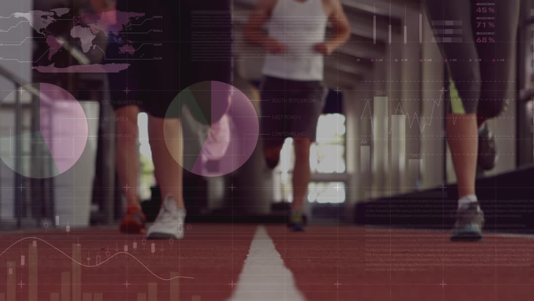 People Running Indoors with Data Overlay Illustrating Fitness Video