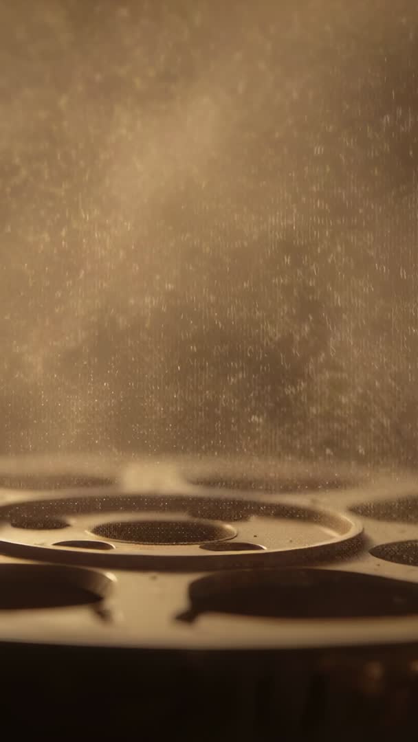 AI Generated Video. Vertical macro footage showing perforated metal disc emitting fine golden mist, backlit to reveal rising plume and suspended particles. Gentle airflow creating soft haze and shimmering bokeh across concentric plate holes. Warm tonal palette and shallow depth producing cinematic, abstract texture suitable for overlays. Useful for motion backgrounds, title sequences, social vertical reels, product presentations, industrial or scientific visuals, and visual effects plates. Providing loopable slow-motion clip for mood building, transitions, and promotional content. Delivering tactile, atmospheric element for designers and editors seeking organic particle movement and warm ambience.