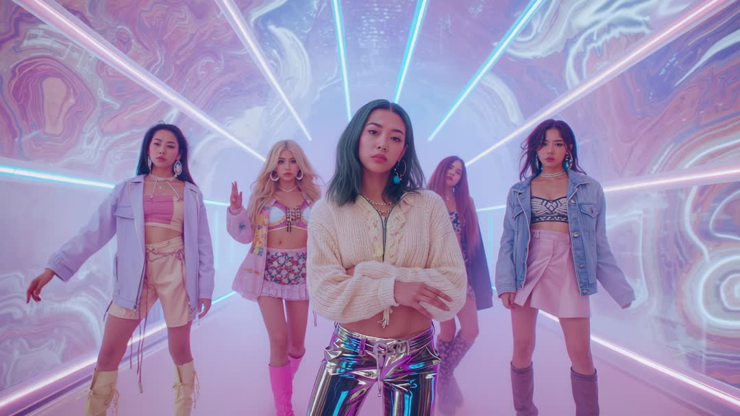 AI Generated Image. Five performers in trendy attire create striking peace signs while dancing energetically in a luminous, multi-colored neon tunnel. Ideal for themes related to youth culture, fashion, choreography, futurism, or modern artistic expression, it highlights dynamic group performance and vibrant staging in a high-energy and visually appealing environment.