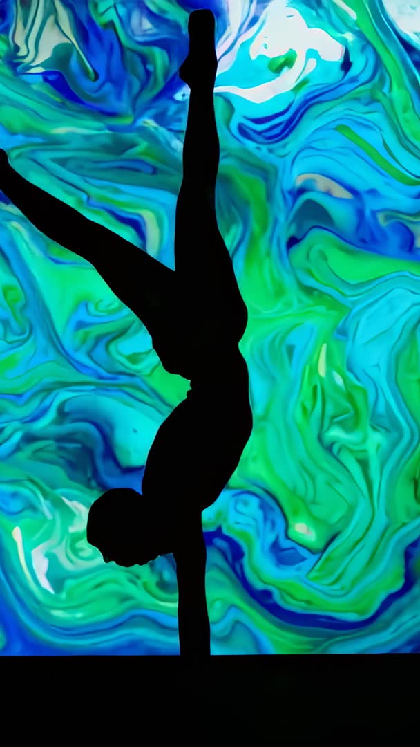 AI Generated Video. Featuring one-arm handstand silhouette balancing on platform against swirling blue-green liquid projection. Emphasizing strength, balance, flexibility, and elegant line for dance, circus, acrobatics, performance art, and fitness promotions. Providing high-contrast backlit composition in vertical 9:16 format ideal for social media Reels, TikTok, Instagram Stories, and mobile ads. Suggesting usage as event opener, trailer backdrop, class promo, choreography showcase, website hero, gallery installation, or live show visual loop. Colorful abstract motion offering flexible creative treatment for editorial spreads, wellness campaigns, contemporary art projects, and branding visuals.