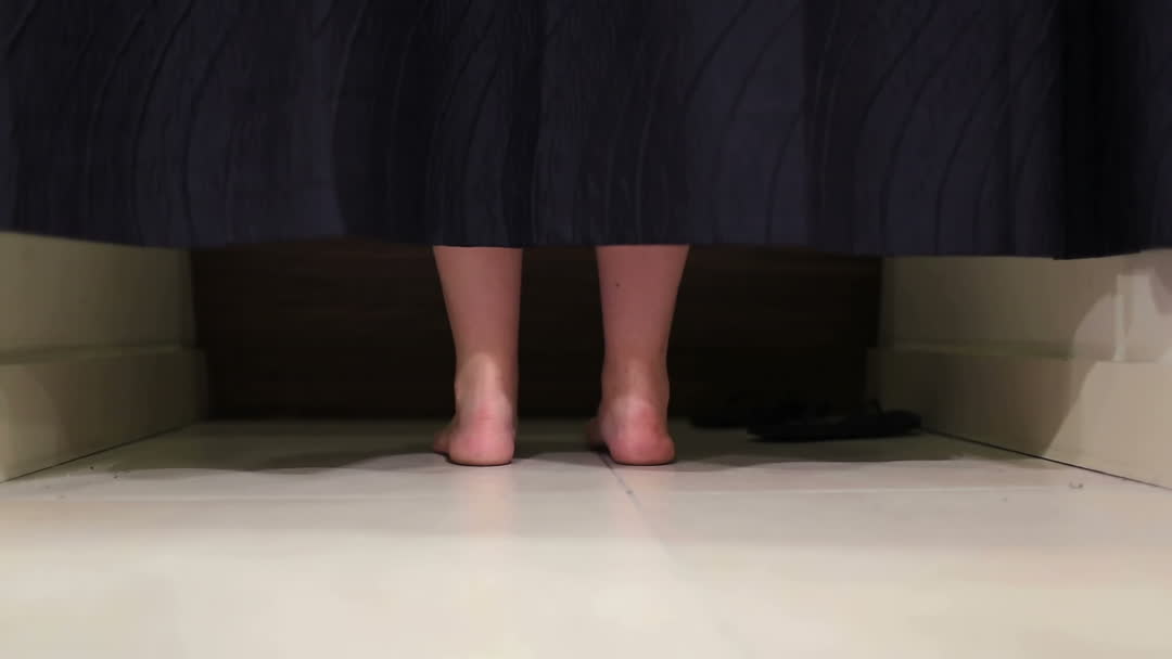 This shows a person inside a retail dressing room, with feet partially visible, indicating privacy and a typical shopping experience. This can be used in contexts relating to shopping, privacy, or clothing stores, and is suitable for retail advertisements or articles on consumer experiences.