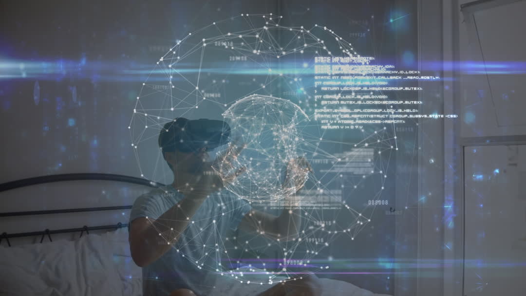 Individual sitting on bed using virtual reality headset with a large, interactive hologram that displays data and network connections. This imaginative and futuristic scene is perfect for presentations on advancements in technology, articles exploring VR applications, and illustrating concepts of digital communication in educational materials.