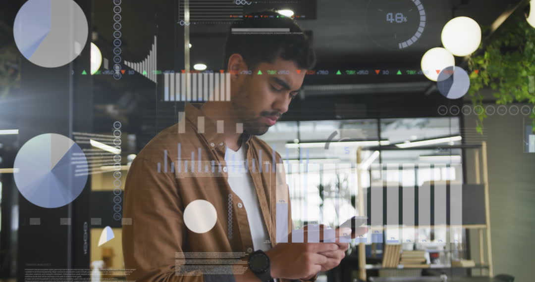 A person is examining data analytics on a smartphone surrounded by digital charts and graphs in a business office. The workspace is modern, with an emphasis on digital and technological integration. This can be used for illustrating business strategy sessions, digital marketing, financial analysis, or modern technology-centric work environments.