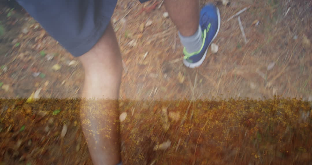 Hiking on a trail during autumn, showcasing vibrant colorful leaves underfoot. Ideal for projects related to nature exploration, seasonal activities, or promoting outdoor sports and fitness.