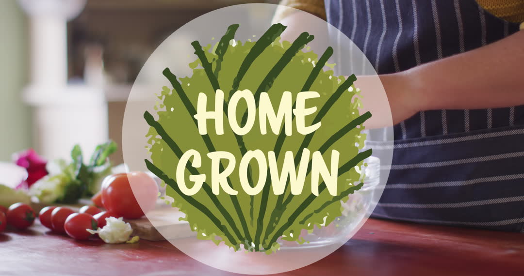 Person wearing apron preparing fresh vegetables in kitchen. A circular emblem with 'Home Grown' text overlays, emphasizing organic and local produce. Ideal for content related to healthy eating, organic farming, home cooking, or culinary workshops.