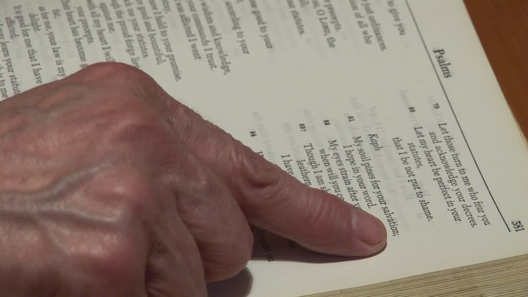 - Person reading the Book of Psalms, focus on hand and scripture text
