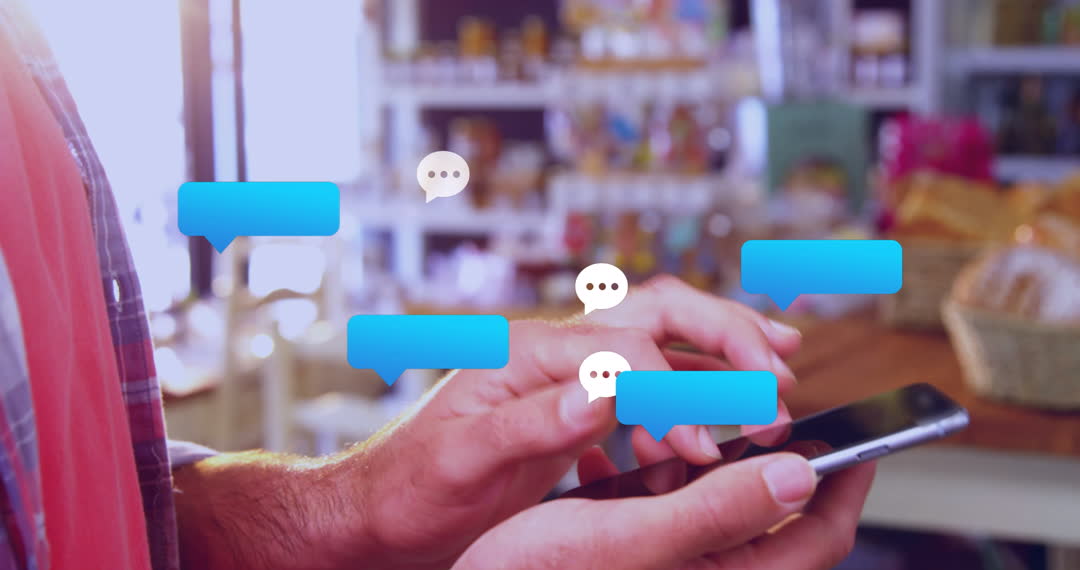 Hands are shown typing on a smartphone, with multiple floating message bubbles indicating active communication. This concept is useful for illustrating messaging, digital communication, or technology-driven interactions in promotional materials, presentations, and marketing targeting new tech products or messaging applications.