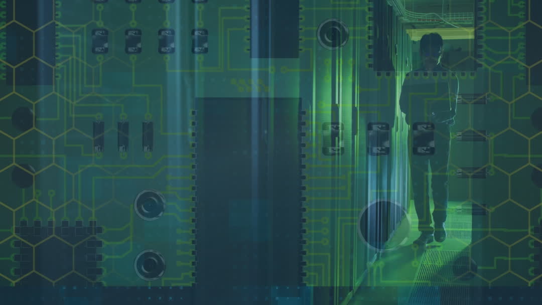 Animation presents person walking in dark server room with overlay of digital circuitry and light patterns. Conceptually emphasizing intersection of technology, cybersecurity, and communication. Suitable for content highlighting data centers, secure digital networking, and high-tech environments.