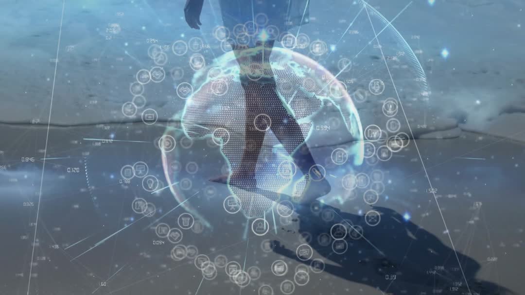 Image captures a person walking on a beach with an advanced digital network and data visualization overlay. Ideal for use in technology presentations, digital innovation cases, promotional materials related to cybersecurity, and futuristic project atmospheres.