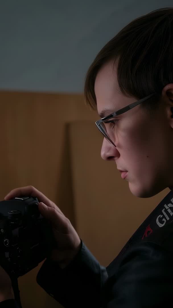 AI Generated Video. Close-up vertical video showing side profile of young man wearing glasses and dark jacket adjusting DSLR controls in dim indoor studio, focused expression while preparing for portrait shoot. Footage working well for photography tutorials, gear review videos, behind-the-scenes reels, social media stories, website hero videos, online course content, and workshop promotion. Editors finding easy-to-use segments for B-roll, cutaway shots, intros, and transitions; color grading toward warm tones enhancing skin and mood. Suggestions for use: crop for mobile story format, add lower third text for branding, overlay instructional captions when showing manual controls. Rights note: check model release for commercial use when featuring identifiable individual; consider standard stock licensing.