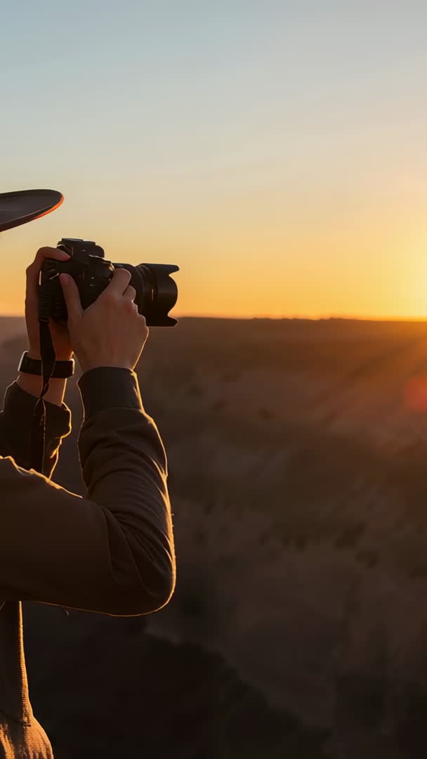 AI Generated Video. Showing photographer capturing warm golden hour sunset with DSLR on ridge overlooking canyon. Featuring backlit silhouette, lens flare, soft orange sky and dramatic shadowed foreground. Filmed in vertical format for mobile use and social media, providing cinematic feel and strong visual contrast. Ideal for travel videos, outdoor adventure promos, landscape vlogs, photography tutorials, social posts, hero headers and background clips. Allowing easy cropping for stories, reels, reel covers and mobile ads. Suitable for lifestyle, tourism, photography brand content, gear reviews, workshop promotion and inspirational campaigns.