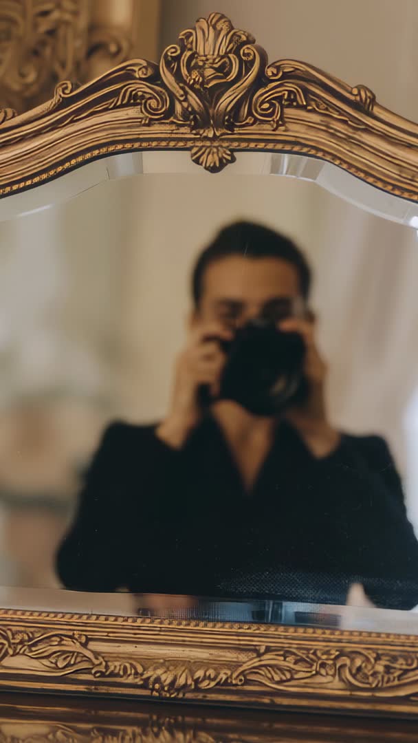 AI Generated Image. Featuring photographer stepping into gilded mirror while raising DSLR and framing vertical editorial shot. Ornate gold frame and soft bokeh creating cinematic, luxurious atmosphere with shallow depth of field and warm tones. Vertical composition optimized for mobile-first content, social media reels, and editorial storytelling. Ideal for behind-the-scenes sequences, photography tutorial intros, brand campaigns for luxury interiors, creative portfolios, and blog headers. Suggest using slow push-in or rack focus edit, ambient music bed, subtle color grade enhancement, and overlay text for title or call-to-action.