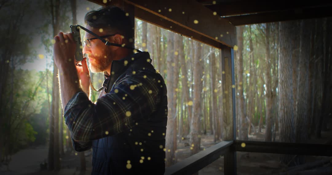 A bearded man stands on a wooden porch edging a dense forest, skillfully adjusting a vintage film camera as beams of golden sunlight illuminate drifting particles around him. Ideal for themes of photography, exploration, creativity, technology nostalgia, and peaceful outdoor experiences.