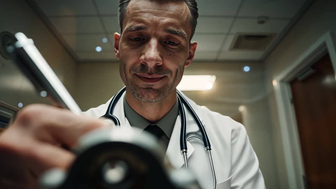AI Generated Image. Male physician leaning over clipboard and writing patient notes in clinic consultation, wearing white lab coat and stethoscope. Low-angle close-up showing focused facial expression and hand movement, emphasizing clinical documentation workflow and patient record keeping. Mood conveying professionalism, trust, care and attention to detail. Ideal for medical education videos, healthcare website hero clips, EHR tutorial footage, telemedicine promotion, patient intake and documentation training. Suitable for advertising hospital services, clinical workflow articles, medical blog posts, patient information leaflets, corporate healthcare presentations, social media healthcare campaigns. Editing suggestions include adding subtle ambient music, on-screen text overlays for key points, and cutaways to patient interaction or computer screens for narrative context.