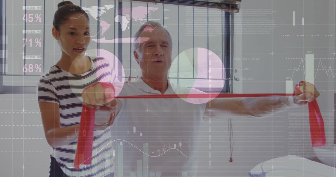 Photo depicts a clear and impactful scene where a physiotherapist assists a client with arm exercises using a red band, symbolizing strength and rehabilitation. Transparent overlays suggest data analysis related to health outcomes and progress tracking. Perfect for illustrating topics related to physiotherapy, healthcare improvement, training protocols, and well-being practices.