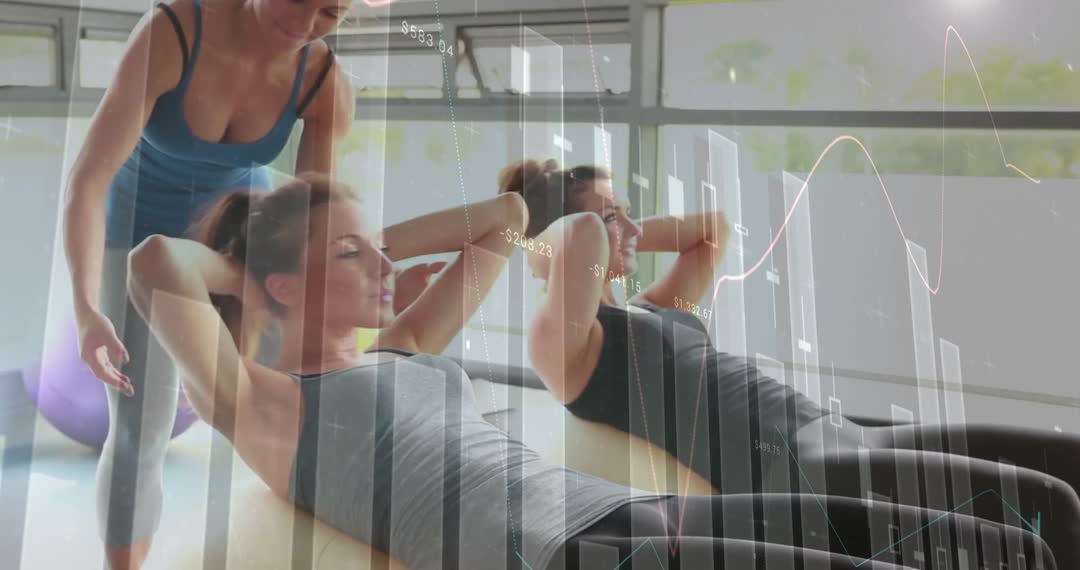 A Pilates instructor supervises two clients exercising, while financial charts and data appear overlaid as part of a conceptual blend between health and modern analytics. Use this video for concepts involving multi-tasking, integration of fitness with business analytics, or innovative fitness technology strongly suggesting broader well-being enhancement practices.