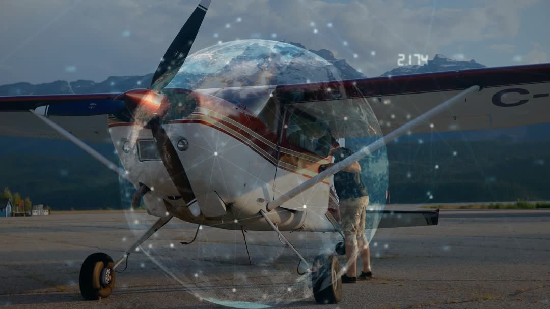 Showing single-engine propeller plane on mountain airport ramp with pilot performing preflight inspection while globe HUD overlay and network nodes highlighting navigation and connectivity data. Combining practical maintenance action with futuristic augmented reality graphics to communicate modern aviation workflows and digital flight assistance. Ideal for illustrating pilot training, flight safety campaigns, aircraft maintenance procedures, aviation technology demos, AR in transportation, and flight planning tools. Suiting corporate videos, e-learning modules, technical presentations, aviation blogs, airport promotional material, social media ads, and broadcast segments. Offering clean composition and space for lower thirds, titles, and call-to-action overlays. Color palette and daylight clouds supporting themes of technology, safety, and outdoor adventure.