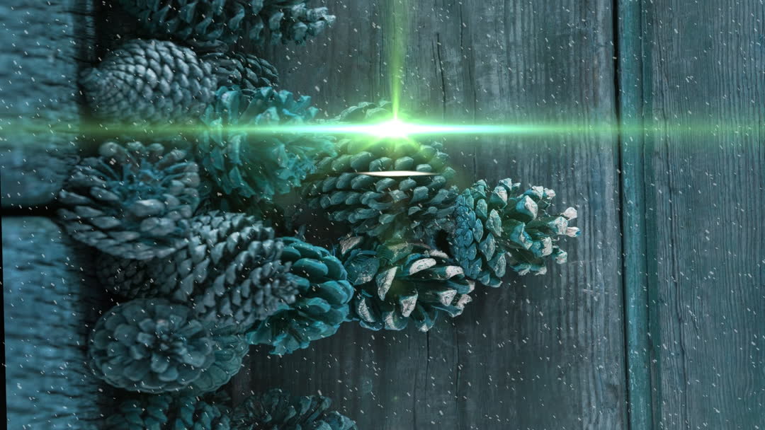 Animation features illuminated pine cones placed against wood, used in festive projects. Suited for Christmas themes, offering seasonal visual. Green light enhances serene celebration.