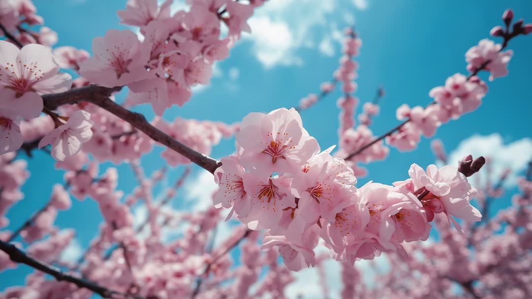 AI Generated Image. Beautiful scene of cherry blossoms swaying in gentle spring breeze. Camera shifting focus on delicate pink petals with vivid blue sky contrasts their natural beauty. Ideal for promoting seasonal content, nature videos, or floral backgrounds. Invokes serenity and appreciation for blooming flora in gardens or natural reserves.