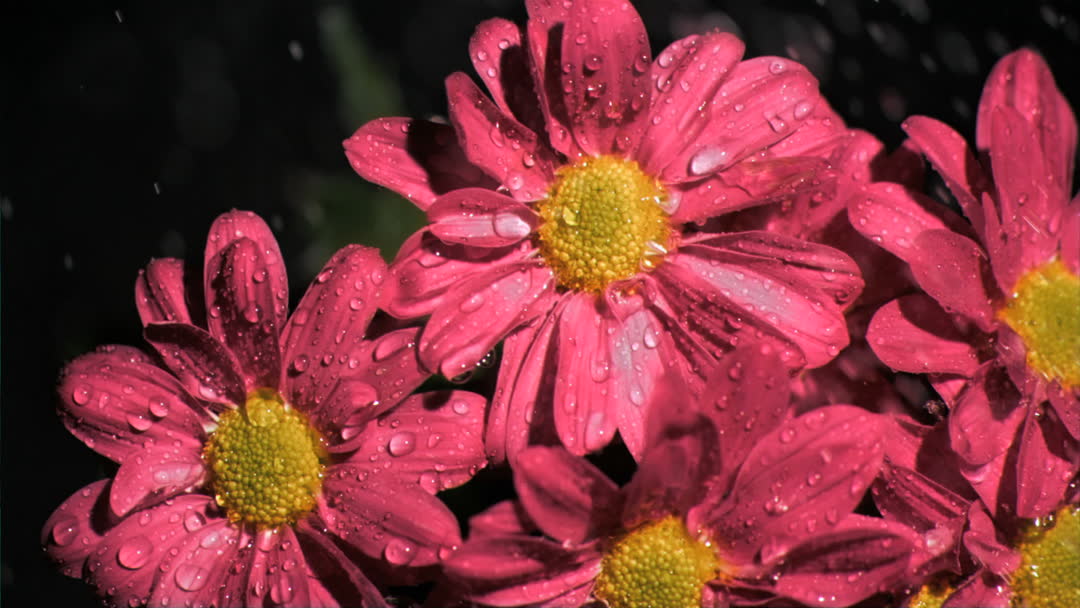 This video features pink chrysanthemums with petals glistening under water droplets, set against a dramatic black background. Perfect for use in nature blogs, floral-themed websites, gardening publications, or motivational posters showcasing beauty and resilience. The contrast highlights the vivid colors of the flowers, ideal for backgrounds or decorative elements capturing freshness and life.