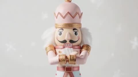 AI Generated Video. This looping clip presents pink-painted nutcracker soldier crossing arms against soft grey backdrop with floating snowflake bokeh, pastel palette, and warm metallic accents. Featuring close-up framing, shallow depth of field, and gentle studio lighting that enhances carved details and ornate crown. Suits holiday advert, seasonal social media post, website banner, greeting card animation, storefront display, or product packaging. Works well as background loop for festive video overlays, title cards, and e-commerce header. Try adding subtle pan or gentle zoom for extra motion or placing text overlay on left negative space for campaign messaging. Mood evokes nostalgic, whimsical, elegant holiday decor and family tradition.