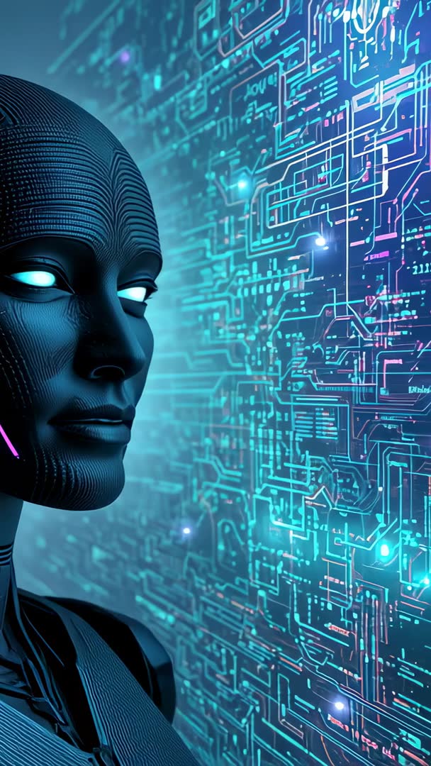 AI Generated Image. Showing close-up profile of plated android with illuminated eyes scanning glowing circuitry wall. Featuring textured synthetic skin, chrome panels, neon blue and magenta highlights, and dynamic circuit traces activating across vertical panel. Composed for vertical video with ample right-side copy space for text overlays and lower-third graphics. Working well for technology marketing, AI concept campaigns, cybersecurity presentations, startup pitch decks, sci-fi trailer intros, social media reels and website hero sections. Creative suggestions: apply slow push-in camera movement, add subtle parallax between android and circuitry, use ambient synth soundtrack and cinematic riser for dramatic impact, color grade emphasizing teal and magenta contrast. Export recommendations: 9:16 aspect ratio, 4K for high-resolution cropping, provide loopable 10-30 second cut for social platforms. Licensing notes: suitable for editorial and commercial tech themes.