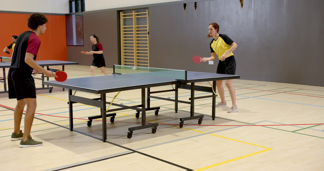 Players are intensely focused on a table tennis match inside a gymnasium. They are wearing sporty attire suitable for competitive play, presenting a theme of concentration and athleticism. This can be used in content focused on indoor sports, athletic competitions, or sports training programs.