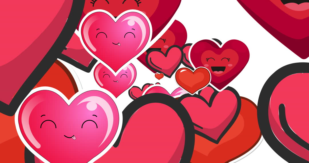 Animated depiction of adorable hearts exhibiting joy on a white background. Ideal for Valentine's Day promotions, romantic greeting cards, children's animations, or affectionate social media content. Enhances themes of love, joy, and happiness in illustrations.