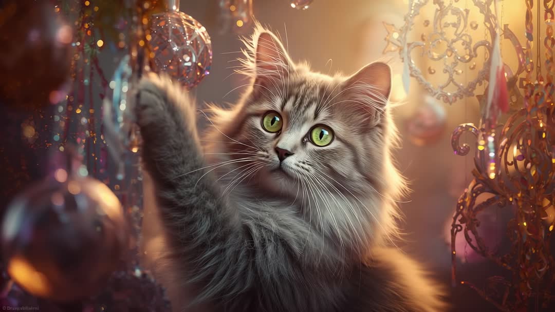 AI Generated Video. A fluffy tabby cat playfully reaching for holiday ornaments and beads, catching glimmers of warm fairy lighting. The setting conveys a festive and cozy atmosphere, perfect for representation of celebratory home settings or pet-themed seasonal greetings.