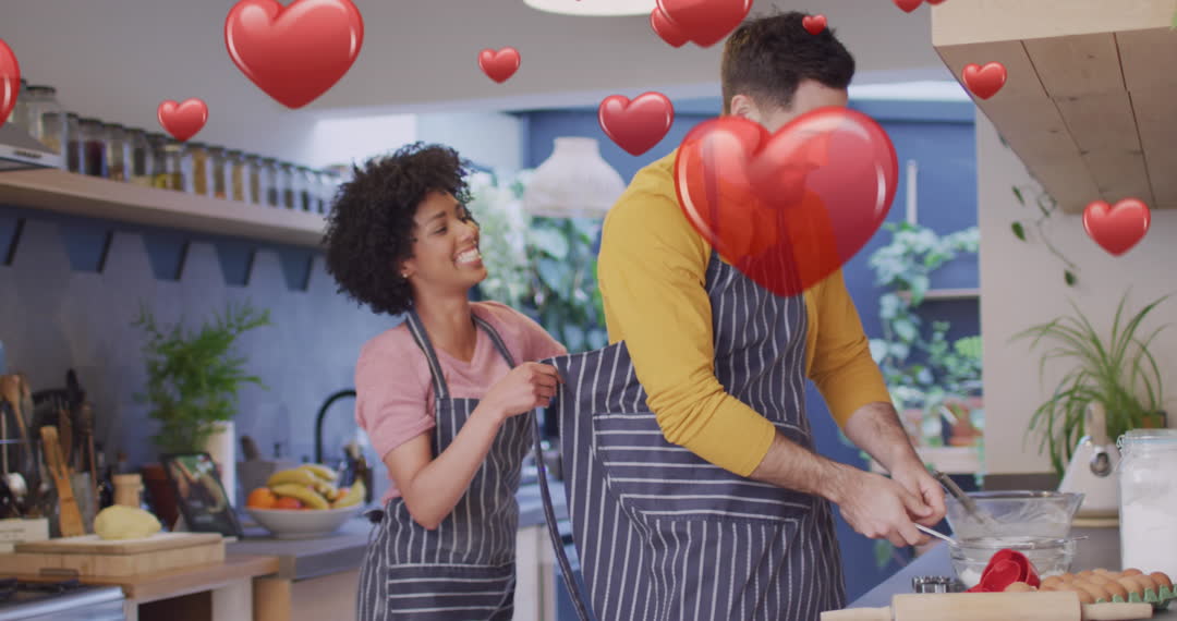 This lively scene shows a diverse couple wearing striped aprons, joyfully engaging in cooking together in a well-styled kitchen. The playful interacting moment is highlighted by floating heart animations, depicting love and affection. Perfect for use in lifestyle blogging, cooking channels, romantic relationship articles, or audiovisual projects centered around domestic bliss and partnership.