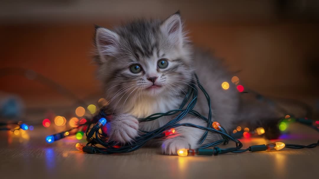 AI Generated Video. Showing gray-white tabby kitten playing with colorful LED string lights on wooden floor, captured in close-up with shallow depth of field and warm bokeh highlights. Clip featuring fluffy fur, curious green eyes, and playful paws tangling with glowing bulbs, creating cozy and festive mood. Ideal for holiday marketing, social media reels, pet product advertising, greeting card animations, blog headers, lifestyle content, and veterinary or pet care displays. Suggested edits include looping short segments, slowing motion for playful detail, adding cheerful music and overlay text on blurred background, and color grading for warmer tones. Including reminder about keeping pets safe around live lights and supervising during shoots.