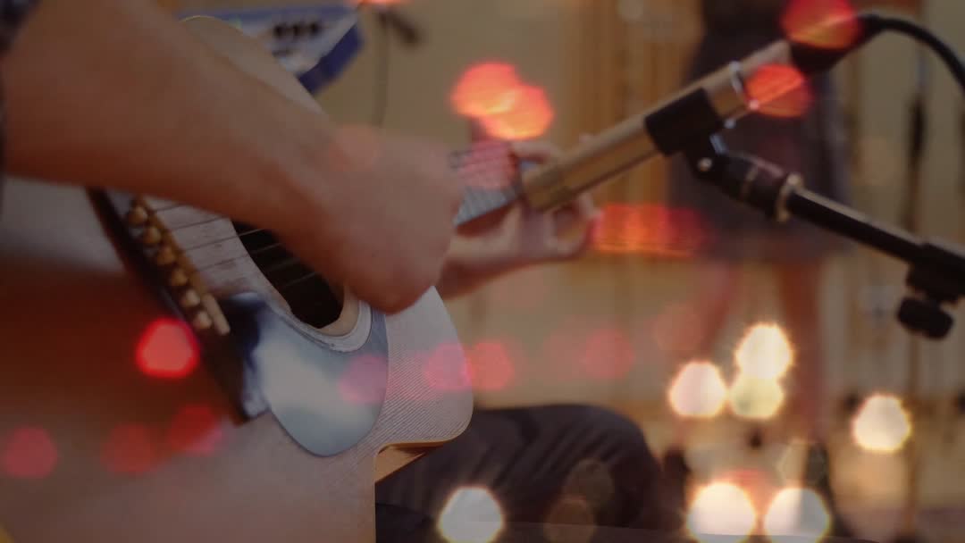 Footage showing close-up of hands strumming acoustic guitar with shallow depth of field and warm bokeh highlights. Microphone sitting near sound hole capturing rich acoustic tone. Lighting creating cozy, intimate mood with soft red and amber bokeh. Scene working well for background clips on music blogs, promotional trailers, album social posts, tutorial videos, and streaming intros. Editors using clip for looping backgrounds, lower-thirds, title overlays, product ads for musical gear, and singer-songwriter promo reels. Recommending color grading toward warm tones, adding gentle film grain, and syncing close-mic audio for authentic sound. Clip looping easily for short ambient video beds or social media stories. Footage delivering organic, tactile feel and DIY studio authenticity.