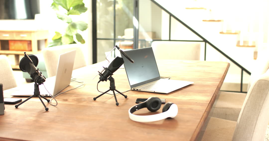 - Podcasting Setup in Modern Home Office on Wooden Table