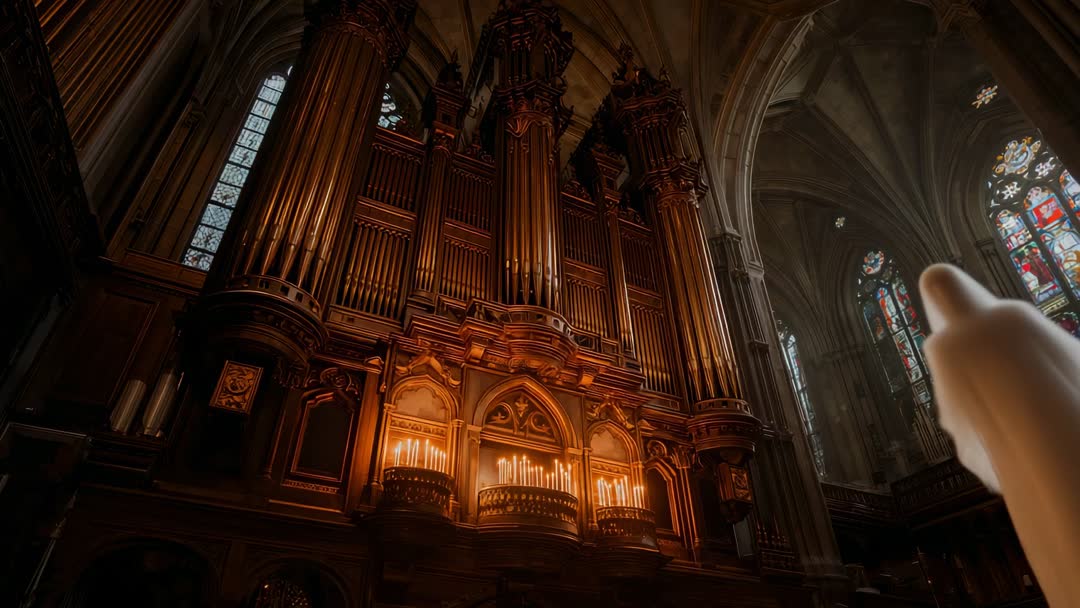 Pointing to Gothic Cathedral's Illuminated Pipe Organ Video