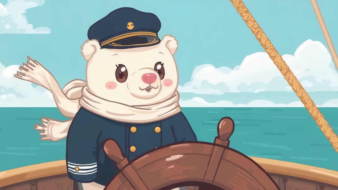 AI Generated Video. Video clip showing polar bear captain steering sailboat across turquoise ocean, wearing navy coat and scarf, gripping wooden helm and keeping steady course. Bright pastel palette and friendly expression creating warm, family friendly mood. Offering whimsical maritime character design for children's book animation, nursery wall art, educational video, social media clip, and product packaging. Ideal for brand mascot animation, travel blog intro, seasonal greeting cards, toy packaging, and kids TV opening. Providing clear center composition and wide horizon for title overlays, lower thirds, and logo placement. Working well as loopable clip for animated banners, web hero sections, and short promotional spots. Including optional AI-generated credit when required by platform.