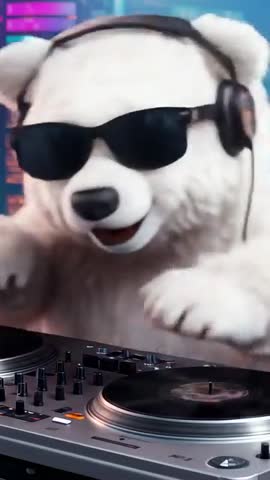AI Generated Video. Showing polar bear DJ wearing sunglasses and headphones, leaning on mixer while scratching vinyl on turntables in neon-lit studio. Bright neon colors and dynamic close-up framing creating energetic club vibe. Vertical format optimizing mobile viewing and short-form platform compatibility. Suiting social media reels, TikTok clips, Instagram Stories, YouTube Shorts, Twitch livestream intros, DJ set promos and event teasers. Working well as loopable background for livestream overlays, streamer avatar, channel bumper or animated banner. Serving marketing needs for electronic music brands, club nights, streetwear campaigns, children entertainment channels and mascot-driven ads. Recommending export as looped MP4 or vertical GIF, pairing with upbeat electronic soundtrack, neon typography and bold call-to-action.