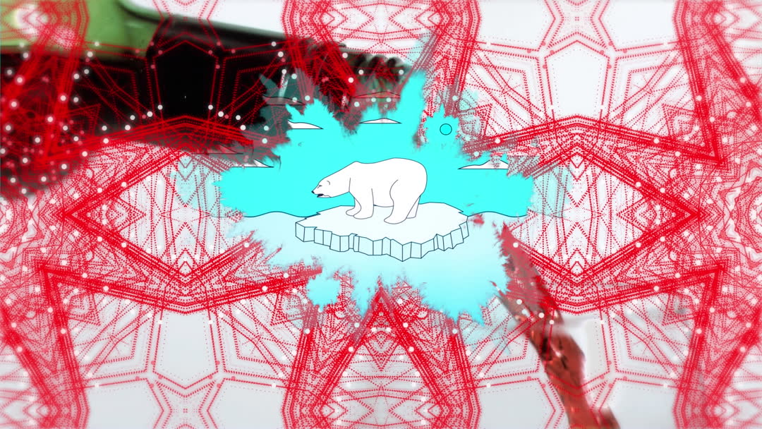 Animated depiction showcasing environmental contrast with a polar bear on ice floe surrounded by intricate red patterns and symbolically clashing with red wine pouring. Highlights climate change and video tension blend. Useful for topics on ecological awareness, conservation campaigns, depicting the tension between luxury/sustainability, creative displays or conceptual art.