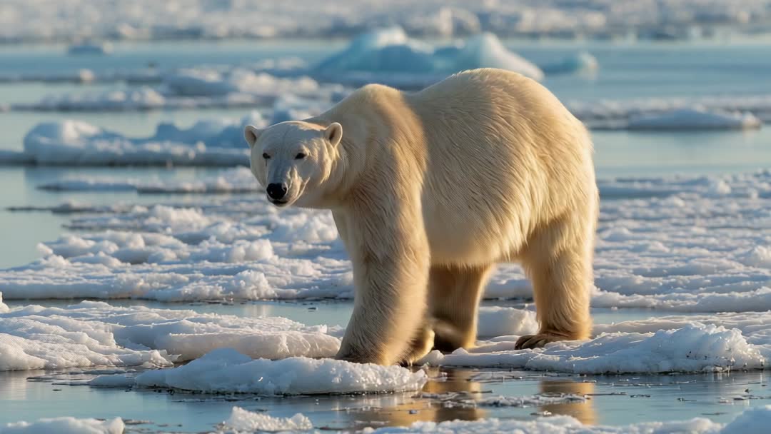 AI Generated Image. Wildlife footage showing adult polar bear starting left and walking across fragmented Arctic sea ice and open water at sunrise, fur glowing in warm golden hour tones while searching for stable ice floe. Low-angle composition capturing texture of fur, reflective water surfaces, and melting ice patterns, creating strong sense of scale and solitude. Suiting environmental campaigns, climate change reports, nature documentaries, educational content, travel and wildlife features, and social media reels highlighting Arctic conservation. Working well as opening shot, dramatic B-roll, website hero header, presentation background, or print layout for calendars and posters. Pairing with ambient ocean and wind audio, slow pans, and cross-dissolve transitions to emphasize mood and urgency of melting polar habitat.