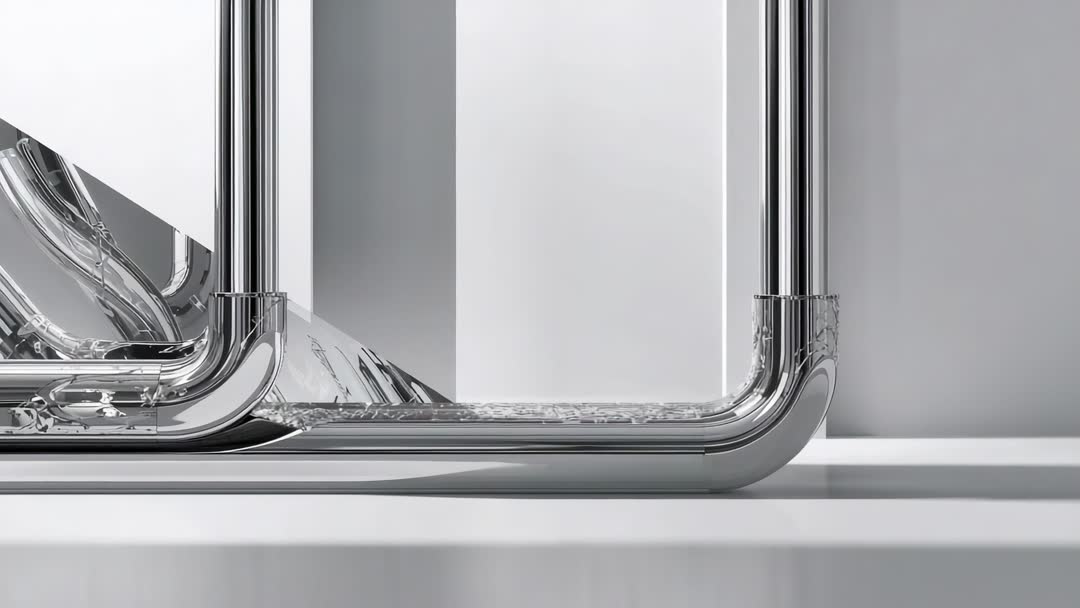 AI Generated Image. Showing polished chrome U-shaped channel carrying clear liquid with suspended bubbles flowing rightward in slow-motion across smooth white pedestal. Highlighting mirrored reflections, sharp chrome edges, subtle bubble textures and clean grayscale palette. Featuring studio lighting producing high-contrast highlights and soft shadows for strong depth and realism. Offering loop-ready motion for extending into background animations or hero video banners. Suiting technology marketing, industrial design presentations, fluid dynamics visualization, luxury product promos, modern architecture and interior design concepts. Serving as close-up abstract visual for social media posts, motion graphics projects, website headers, corporate slides and stock motion libraries.