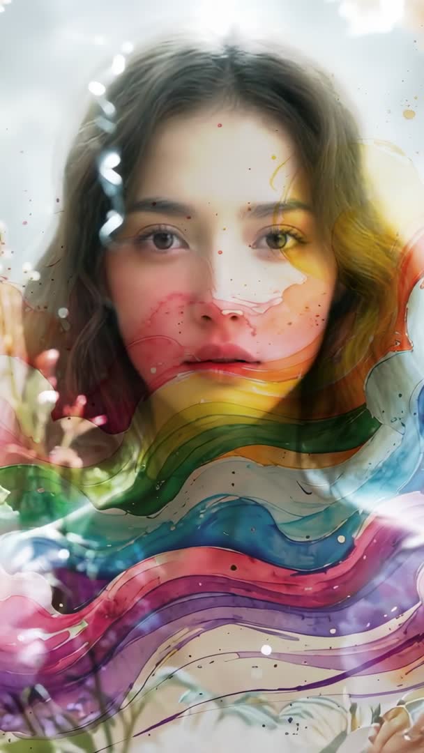 AI Generated Image. Vertical art video showing young woman face merging with flowing rainbow waves, watercolor textures, and drifting glitter. Soft studio light highlighting delicate skin tones while pastel colors rippling across frame. Motion design suiting looping mobile screens, maintaining calm pacing and cinematic close-up. Suiting beauty brand campaigns, wellness and meditation apps, fashion reels, music video overlays, and editorial motion pieces. Pairing well with ambient soundtrack, poetic voiceover, or minimal typography for titles and social headers. Working as intro for music video, portfolio reel, or product launch teaser. Offering atmospheric backdrop for blog covers, presentation backgrounds, and gallery projection. Including vertical MP4 and loop-ready clips for Instagram Stories, Reels, and TikTok, with easy color grade adaptation for brand palettes.