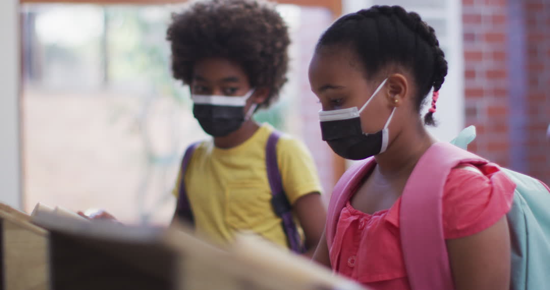 Two young students wearing face masks standing in a school corridor, emphasizing safety measures during the COVID-19 pandemic. Useful for educational materials, articles on public health, illustrating school protocols, or campaigns promoting child safety and health in educational environments.