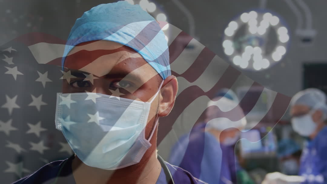 An video showcasing a male surgeon wearing a surgical mask with an American flag graphics overlay, symbolizing the intersection of healthcare and patriotism. Vital in illustrating medical professionalism and national pride. Useful for articles or promotions related to medical services, healthcare reforms, discussions on the integration of national identity in medicine, or recruitment campaigns targeting medical professionals.