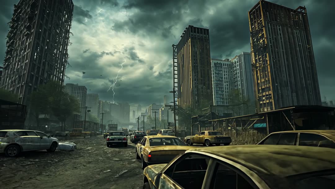 - Post-Apocalyptic City Street with Stormy Skies and Abandoned Vehicles