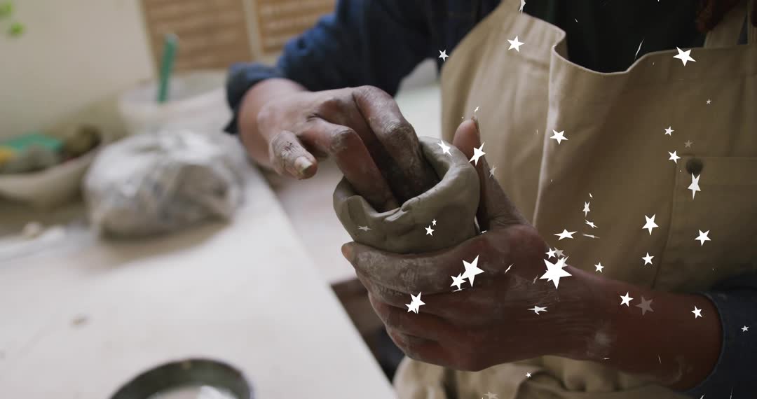 Close-up video showing potter shaping small clay cup by pinching and refining rim. Hands covered in clay and wearing apron, background featuring workbench with tools and wrapped clay. Star-shaped sparkles drifting across frame adding whimsical, magical mood. Footage focusing on tactile process of hand-building and finishing vessel, highlighting finger movements, texture, earthy tones, slow craftsmanship. Serving well for craft tutorial intros, artisan brand promos, e-commerce listings for handmade ceramics, social media short clips, lifestyle storytelling, workshop class promotions. Suggestions for use: crop tight for product detail, add soft background music, loop short section for Instagram Stories or reels, combine with title cards for class signup or shop announcement. Licensing friendly for commercial use in advertising, editorial features on craft culture, DIY content, maker profiles.